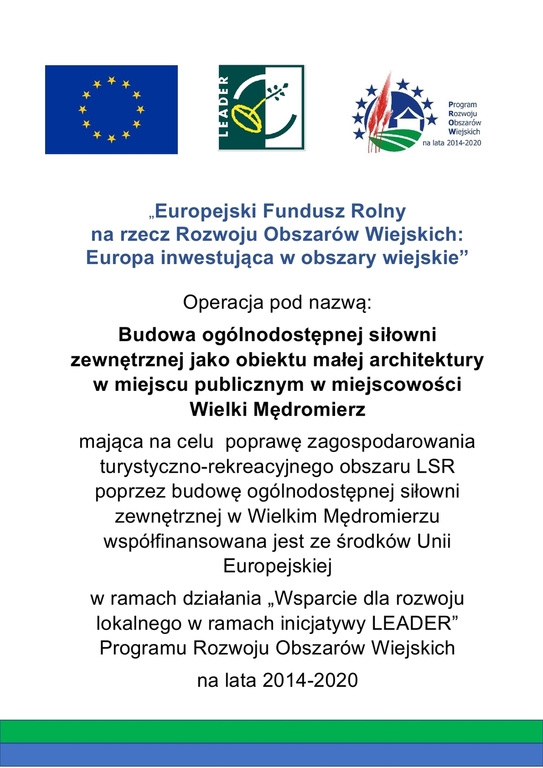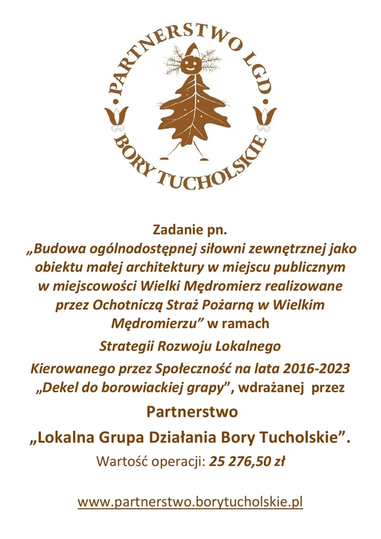 Informujemy, iż Ochotnicza Straż Pożarna w Wielkim Mędromierzu wraz ze Stowarzyszeniem Partnerstwo „Lokalna Grupa działania Bory Tucholskie” z siedzibą w Tucholi w dniu 6 października 2020r. podpisała umowę nr 1/2020/G/PROW/06 o powierzenie grantu w ramach Strategii Rozwoju Lokalnego Kierowanego przez Społeczność na lata 2016-2023 „Dekel od borowiackiej grapy” na operację pod nazwą: „Budowa ogólnodostępnej siłowni zewnętrznej jako obiektu małej architektury w miejscu publicznym w miejscowości Wielki Mędromierz” mająca na celu poprawę zagospodarowania turystyczno-rekreacyjnego obszaru LSR poprzez budowę ogólnodostępnej siłowni zewnętrznej w Wielkim Mędromierzu współfinansowaną ze środków Unii Europejskiej w ramach działania „Wsparcie dla rozwoju lokalnego w ramach inicjatywy LEADER” Programu Rozwoju Obszarów Wiejskich na lata 2014-2020.