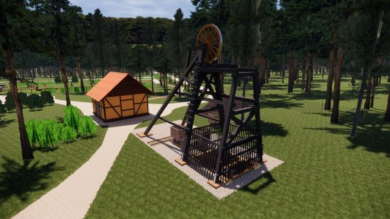 2. Budowa – rekonstrukcja drewnianej wieży wyciągowej o wysokości 8,45m. Wieża w konstrukcji drewnianej prezentująca metodę wydobywania węgla brunatnego w przeszłości wraz z instalacją tablicy informacyjnej bezpośrednio przytwierdzonej do konstrukcji wieży opisującej działanie i funkcjonowanie szybu i wieży w przeszłości oraz oświetlenia wieży w formie niezależnych zestawów lamp LED z panelami fotowoltaicznymi. Rekonstrukcja wieży na podstawie danych archiwalnych.