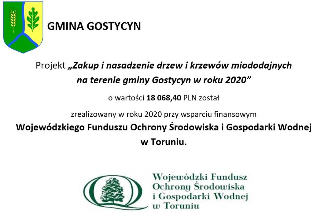 W ostatnich dniach za kwotę 23 tys. zł. posadzono przy drogach gminnych 55 szt. drzew z gatunku lipa drobnolistna, klon pospolity i kaliny koralowej. Do przedsięwzięcia przyłączył się Wojewódzki Funduszu Ochrony Środowiska i Gospodarki Wodnej w Toruniu, który wsparł zakup sadzonek w wysokości 8 600 zł w ramach Programu Priorytetowego Ochrona Przyrody 2020 na zadanie pn. "Zakup i nasadzenie drzew i krzewów miododajnych na terenie gminy Gostycyn w roku 2020" polegające na poprawie estetyzacji gminy poprzez wprowadzenie nowych nasadzeń drzew i krzewów.