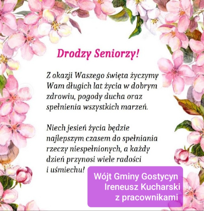Naszym kochanym Seniorom z gminy Gostycyn z okazji Ogólnopolskiego Dnia Seniora życzymy: Długich lat życia wypełnionych dobrym zdrowiem, radością oraz szacunkiem najbliższych. Aby każdy dzień dostarczał wiele radości i uśmiechu na twarzy.