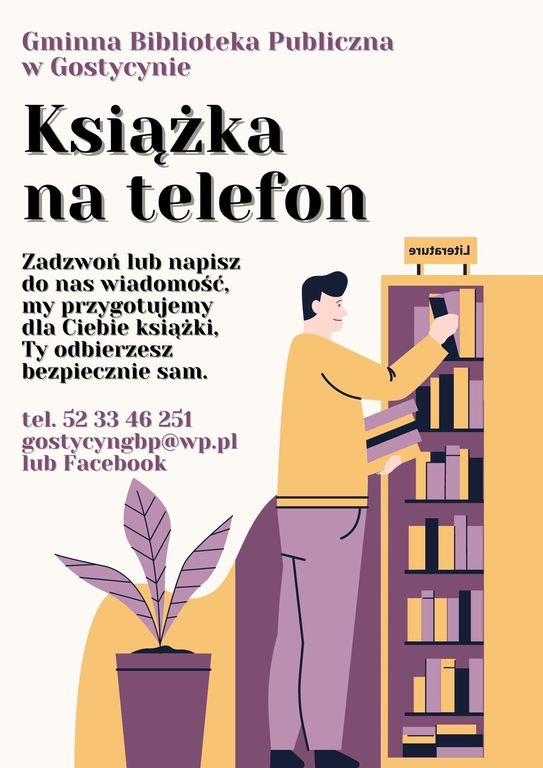 Wychodzimy naprzeciw oczekiwaniom naszych czytelników. Aby ułatwić i umożliwić wypożyczanie książek, uruchomiliśmy akcję pt. „książka na telefon”. Zasady są proste. Czytelnicy mogą do nas zadzwonić (tel. 523346251), napisać e-maila (gostycyngbp@wp.pl) lub wysłać wiadomość na Facebooku (Gminna Biblioteka Publiczna w Gostycynie) z zapotrzebowaniem na konkretne tytuły. My przygotowujemy wybrane książki i zostawiamy je w umówionym miejscu. Przed biblioteką znajduje się szafka bookcrossingowa, która jest teraz miejscem odbioru książek, a na korytarzy przed drzwiami do biblioteki umieszczony jest stolik. Tam czytelnicy mogą również zostawiać książki, które chcą oddać. Wszystkie książki są podpisane imieniem i nazwiskiem, więc czytelnicy łatwo odnajdą te zamówione. Jeżeli możemy pomóc jeszcze w jakiś sposób prosimy o kontakt z nami.