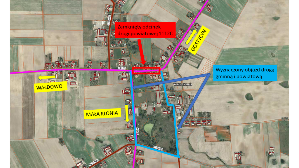 Informujemy, iż z dniem 16.12.2020r. wprowadzona zostanie tymczasowa organizacja ruchu na drodze powiatowej 1112C i 1043C w miejscowości Wielka Klonia. Do 23.12.2020r. prowadzone będą roboty polegające na wykonaniu wyniesionego przejścia dla pieszych przy szkole.