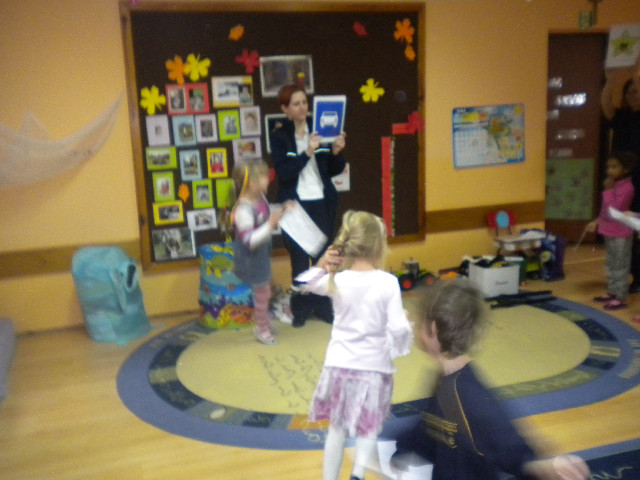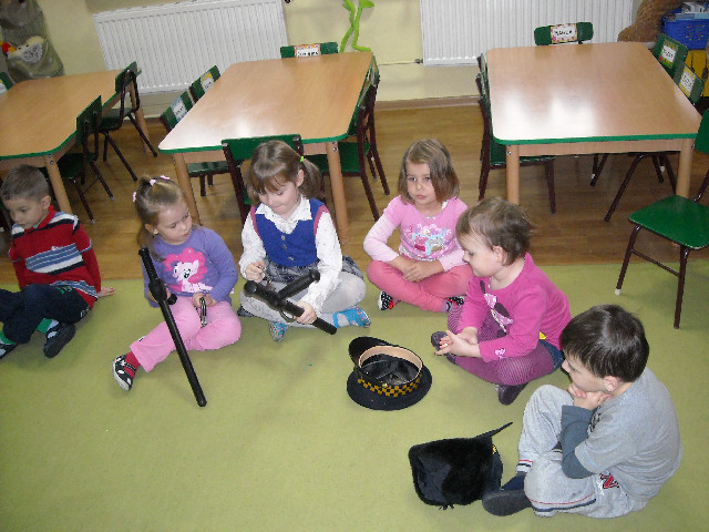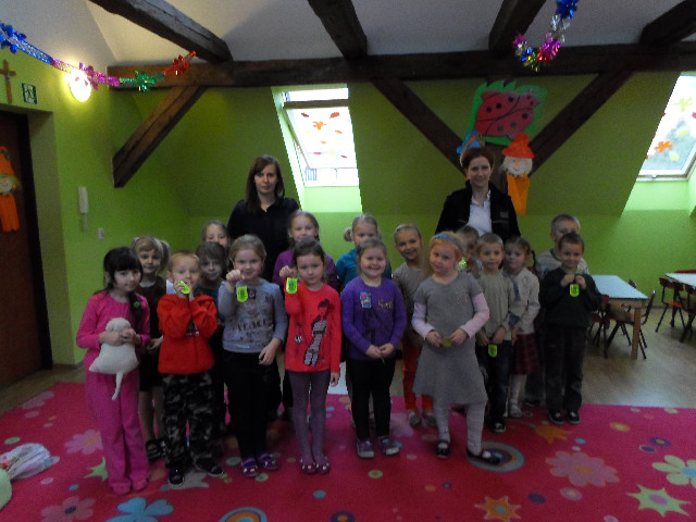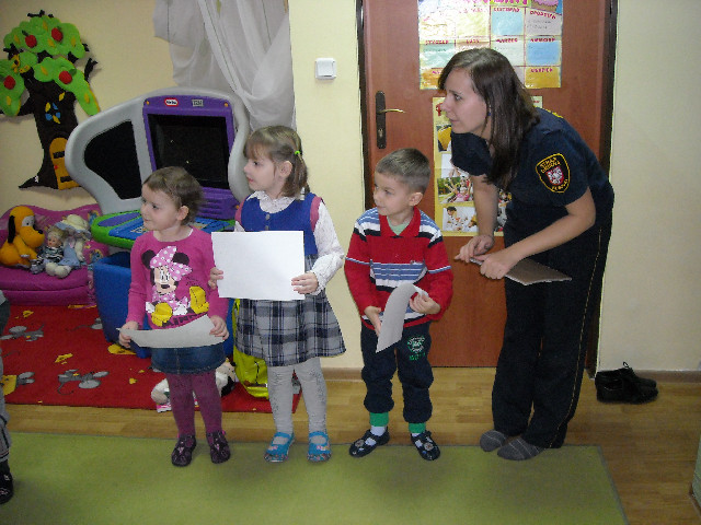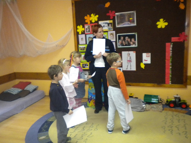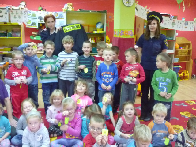 Dnia 15 listopada nasze przedszkole odwiedzili funkcjonariusze Straży Gminnej. W czasie pogadanki dzieci zapoznały się z podstawowymi zadaniami strażników, oglądały elementy umundurowania, rozwiązywały zagadki i odbyły mini szkolenie, w czasie, którego przećwiczyły zasady bezpiecznego podróżowania i poruszania się na drodze. Na koniec otrzymały drobne upominki odblaskowe, mające poprawić ich widoczność na drodze.