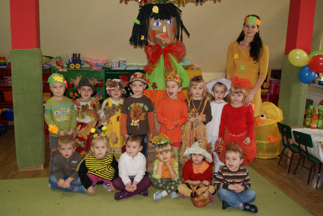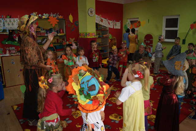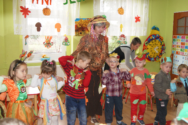 w naszym przedszkolu. Panią Jesień przywitały grzyby, leśne zwierzęta, jesienne warzywa, owoce i wiele innych przecudnych postaci. Jesienne stroje zaprojektowane przez rodziców budziły podziw i zachwyt. Pani Jesień przygotowała dla dzieci liczne zabawy i konkursy, które były nagradzane słodkościami i upominkami. Dzieci rozwiązywały zagadki, przeliczały jesienne skarby, kolorowały, śpiewały piosenki… Nie zabrakło oczywiście degustacji - można było schrupać marchewkę czy skosztować jabłek. Przedszkolaki były zachwycone, ponieważ wiedzą, że w owocach jest dużo witamin, które pomagają im rosnąć zdrowo. Były także wiersze, tańce, i piosenki. Były korowody, kółeczka