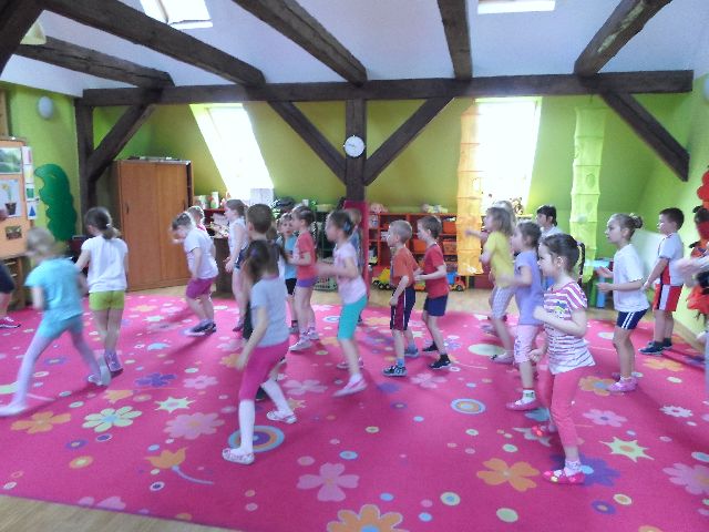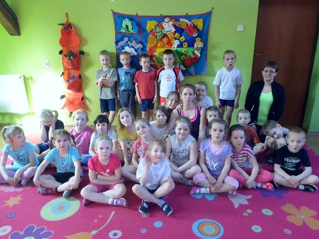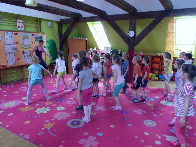 Zajęcia z Zumby  przeprowadziła zaproszona instruktorka Zumby – Karolina  Dzieci zapatrzone nieustannie w prowadzącą tańczyły i śpiewały znane im piosenki w radosnej atmosferze. Po zakończeniu wyczerpującej, ale jednak miłej i wesołej zabawy przedszkolaki podziękowały Pani Karolinie za mile spędzony czas i naukę.