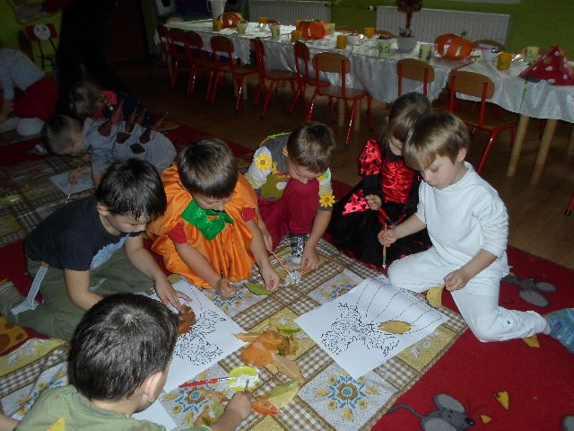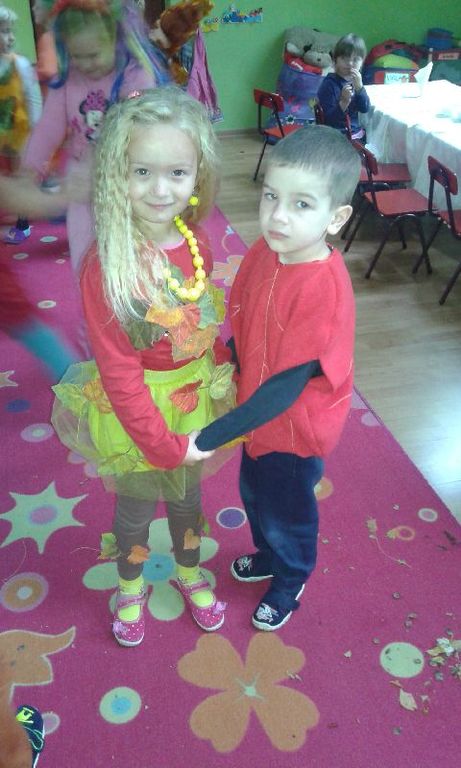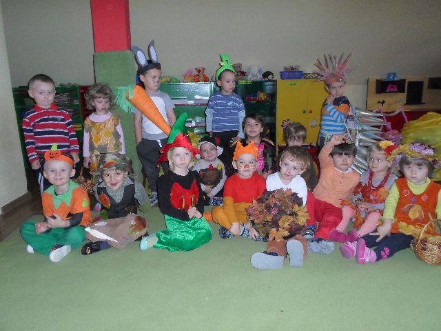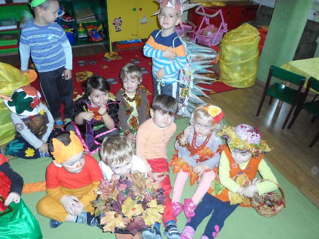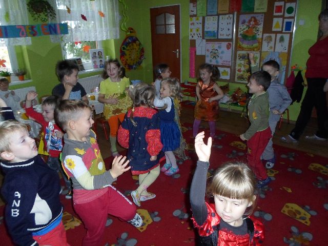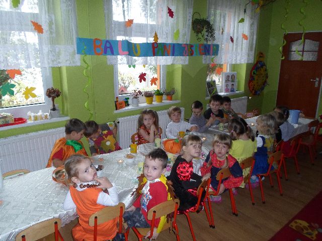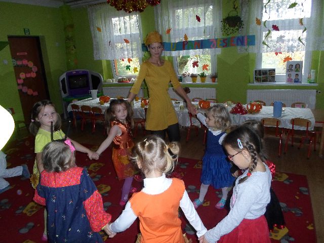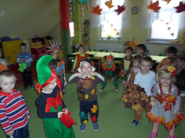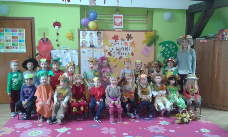 W dniu 19.10.2014 roku w Przedszkolu w Gostycynie odbył się „ Bal    u Pani Jesieni”. Na tym balu nie mogło zabraknąć, jak sam tytuł wskazuje kolorów i ciekawych strojów.  Dzieci  śpiewały znane piosenki o jesieni, rozwiązywały zagadki słowne, wymieniały charakterystyczne cechy jesieni. Wspólnie współdziałały w grupie podczas zabawy naśladowczej leśne zwierzęta . Spróbowały darów jesieni : śliwek, gruszek, jabłek, brzoskwiń. Stworzyły wspólny plakat przedstawiający Panią Jesień :) Dzieci oprócz tego wysłuchały „Bajki o tym, jak powstały kolory”  i bawiły się razem przy muzyce. Przedszkolakom bardzo podobał się bal i już nie mogą się doczekać spotkania z kolejnymi porami roku.