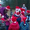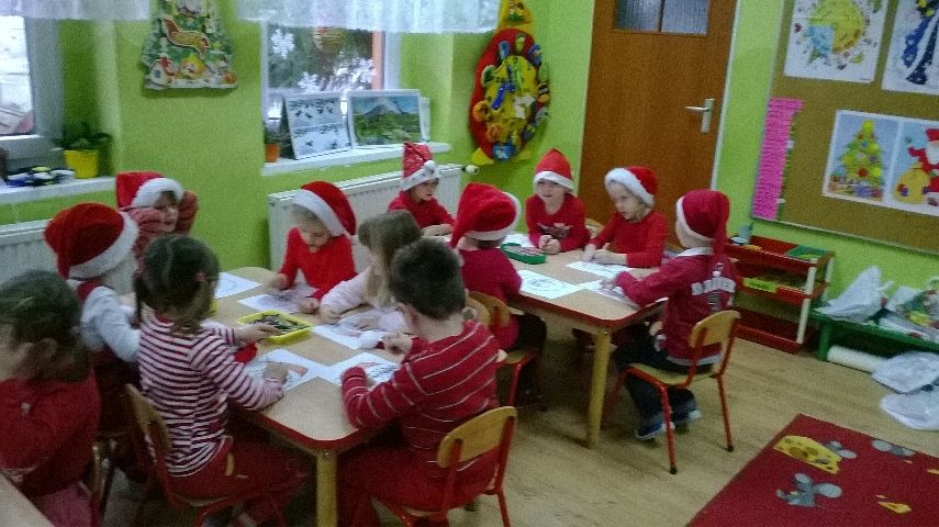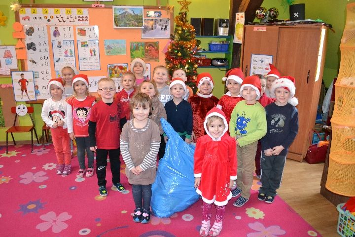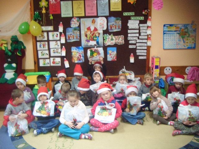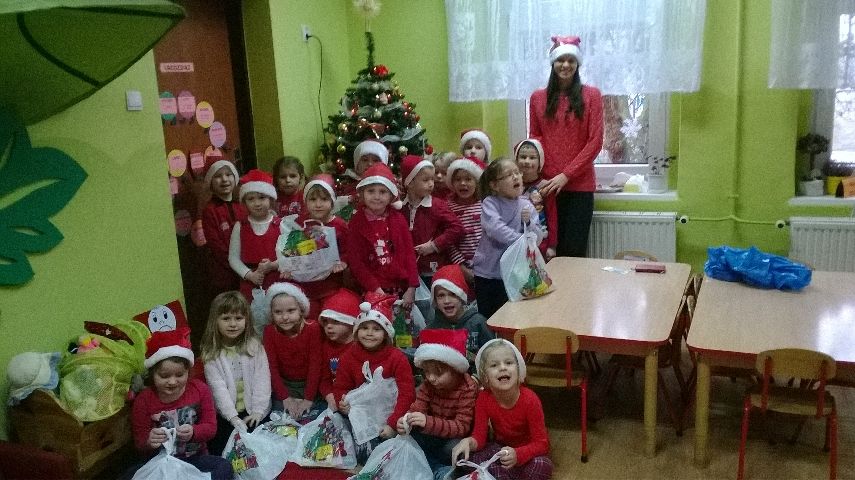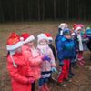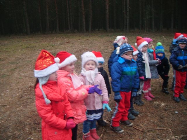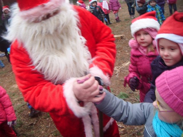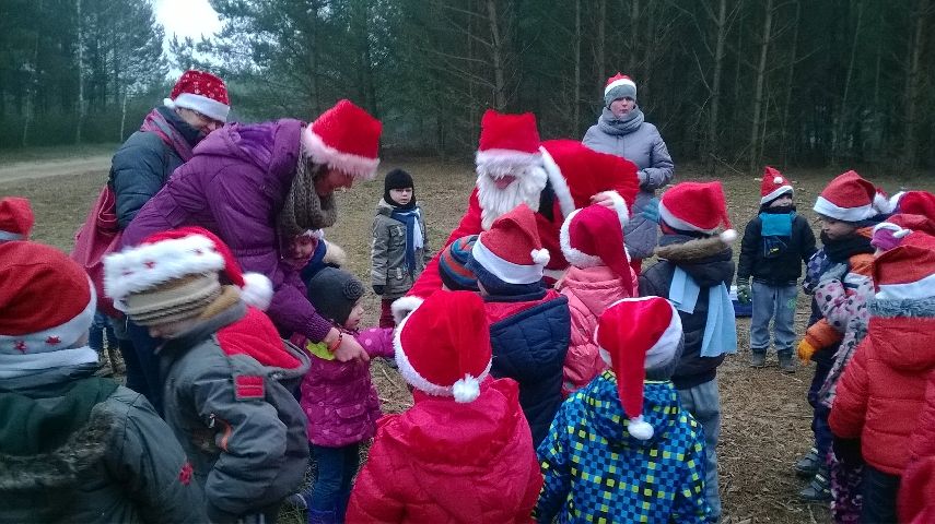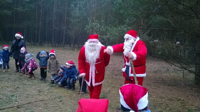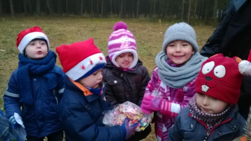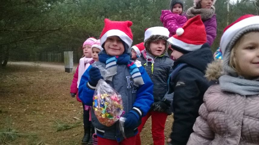 W piękny grudniowy poranek wybraliśmy się do lasu, aby dokarmić zwierzęta. Zabraliśmy ze sobą przyniesione wcześniej pożywienie.  Po krótkim  spacerze znaleźliśmy dwie polanki na których złożyliśmy przysmaki dla zwierząt. Jakie było zdziwienie dzieci, gdy któreś z nich zauważyło w oddali na ścieżce pełno kolorowych śladów – odcisków buta. Wszyscy podążaliśmy tropem tych śladów iiiiiiiiiiiiiiiiiiii ku naszemu zdziwieniu na środku wykarczowanego lasku zobaczyliśmy jedną piękną sosnę. To nie było zwyczajne drzewko, ale magiczne drzewko z cukierkami. Cukierków było pełno, wszystkie były zaopatrzone w zagadki, które dzieci rozwiązały w mgnieniu oka. Największą niespodzianką okazała się ostatnia zagadka, której rozwiązaniem był Mikołaj. Dzieci zaczęły głośno krzyczeć to słowo iii stało się- na skraju polany pojawiły się dwa Mikołaje. Zostali przez dzieci owacyjnie przywitani- były wspólne tańce, wiersze i piosenki. Każda grupa otrzymała symboliczną paczkę cukierków, a resztę prezentów indywidualnych Mikołaje zostawili w Przedszkolu.