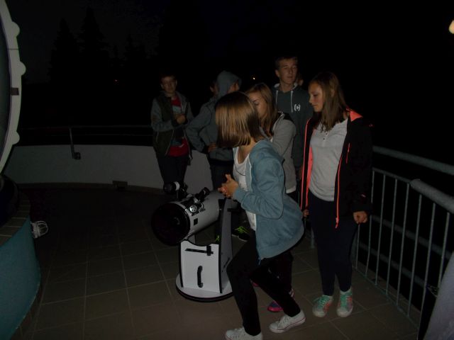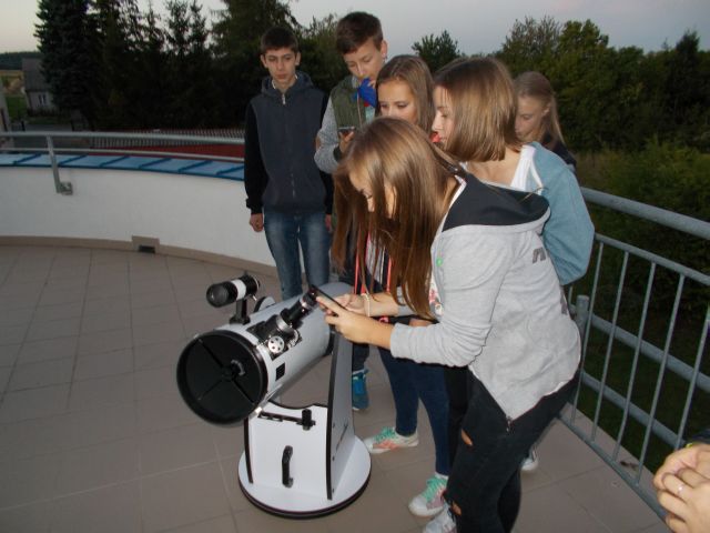 W miniony piątek 18.09.2015 r. przy dobrej pogodzie zorganizowaliśmy w astrobazie obserwacje nieba. Rozpoczęliśmy od Księżyca, który zawsze robi największe wrażenie na obserwujących. Na początku było jeszcze trochę zbyt jasno i Księżyc nie wyglądał tak efektownie, jednak z każdą chwilą robiło się coraz ciemniej, aż w końcu można było dokładnie przyjrzeć się kraterom. Gdy zrobiło się już całkem ciemno zaczęliśmy obesrować Saturna, który znajdował się już dość nisko nad horyzontem. Nie przeszkodziło to jednak w tym, aby każdy mógł zobaczyć tę planetę wraz z jej pierścieniami. Obserwacje zakończyliśmy, gdy Księżyc i Saturn zniknęły z pola widzenia.